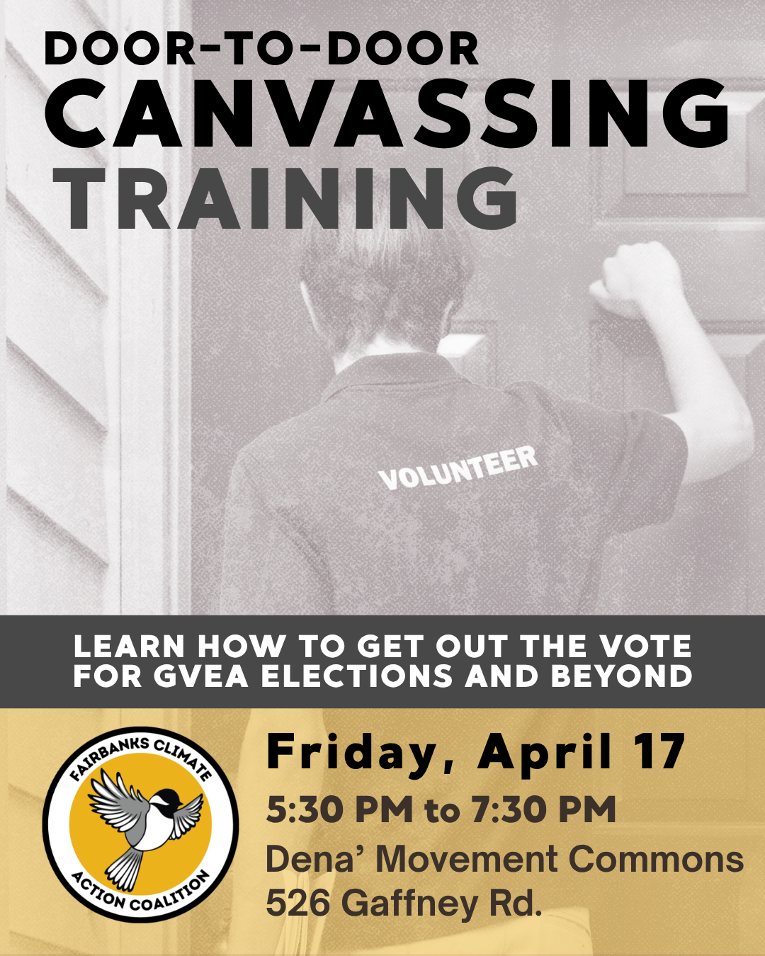 With GVEA elections just around the corner, FCAC’s Renewable Energy working group is getting out into the streets of Fairbanks to canvass for our favorite candidates. We’ll be holding a volunteer canvassing training on April 17th! This training is intended to help folks organize around candidate canvassing and is open to everyone. We will touch on canvassing best practices, scripts you can use, and how to utilize the Voter Action Network app to efficiently hit houses! Come by, say hi, learn a few things, and bring a friend! Food will be provided.